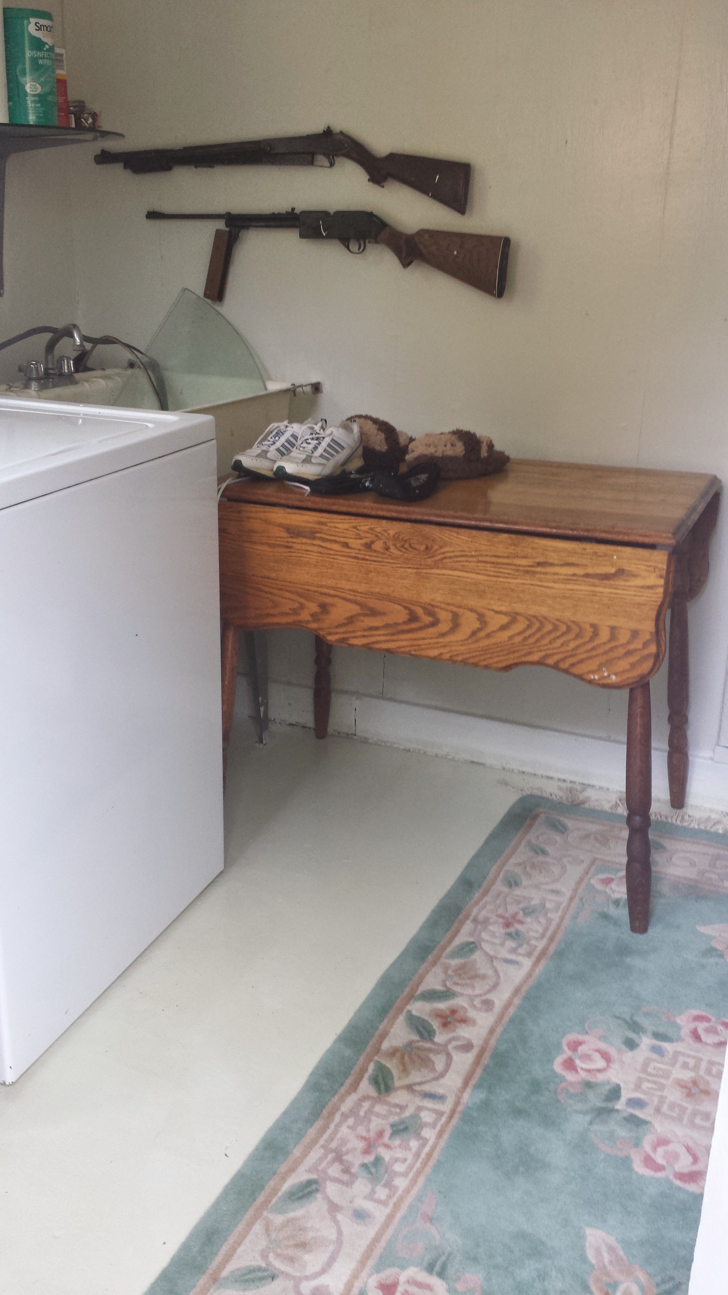This weekend was a continuation of the last in the laundry room, so I won’t bore you with details. My goal was to scrub the whole thing down and paint it, and the reassemble it in a more organized version. I did the floor the same way I did the bathroom. I cleaned it with TSP, then I took 50 gallons of rainwater from my dad’s rainwater collectors, dumped it on the floor and squeegeed it off. Then I used TSP in hot water again and deglossed. Then I primed, painted, and sealed. When I painted, I wore gloves and a whole-body-with-hood disposable coverall, which made for a really sweet cleanup of me. Here are the before and after shots.
