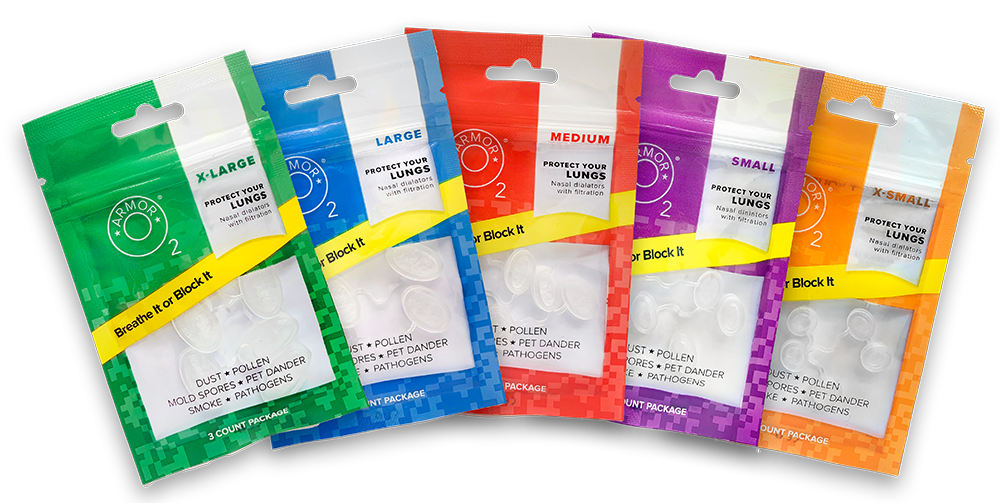 O2 Armor is made from a medical-grade plastic nasal dilator that incorporates filter media from a leading manufacturer. Our filters effectively capture up to 99% of pollen, smoke, dust, lead dust, airborne sawdust, allergens, pet dander, mold, pollution, germs, and viruses measuring down to less than 2.5 microns (PM2.5) in size.
